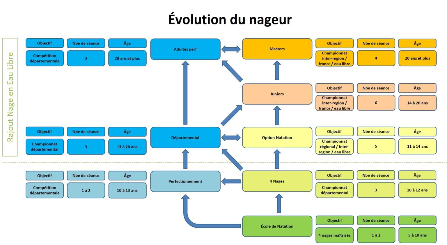 Les groupes d'entraînement structure l'ascension des nageurs depuis leurs détection ou leur intégration dans un pôle compétition